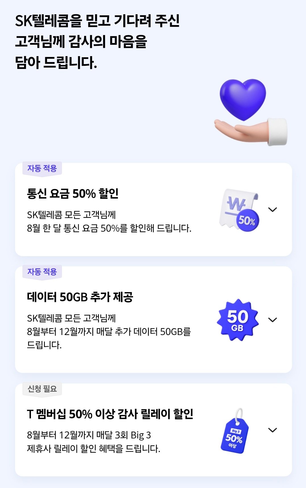➡️혜택: 8월 한 달간 기본료, 문자, 음성, 데이터 등 통신 요금의 50% 자동 할인 적용