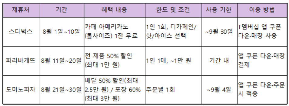 2025년 8월은 SKT 고객이라면 ‘매장 방문’ 또는 ‘앱 쿠폰’ 한 번으로 커피, 제빵, 피자를 모두 큰 폭의 혜택과 함께 경험할 수 있습니다.